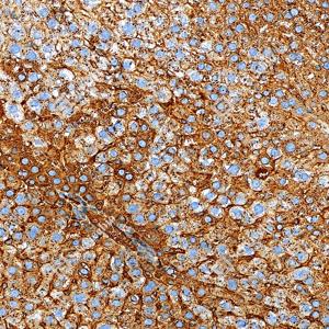 | IHC检测Albumin蛋白(货号 GB152080). 样品: 人肝, 4%多聚甲醛 (货号G1101) 固定12-24小时. 抗原修复: 抗原修复仪 (货号 ARI-4),Tris-EDTA抗原修复液(pH 9.0) (货号G1203), 水浴100℃, 25分钟. —抗: 1: 200稀释, 4℃ 孵育过夜. 二抗: S-vision免疫组化多聚二抗(山羊抗兔),即用型 (货号G1302), 室温孵育20分钟. |