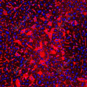| IF检测Albumin蛋白(货号 GB152080)(红色). 样品: 人肝, 4%多聚甲醛 (货号G1101) 固定12-24小时. 抗原修复: 抗原修复仪 (货号 ARI-4),Tris-EDTA抗原修复液(pH 9.0) (货号G1203), 水浴90℃, 30分钟. 封闭: 3% BSA(货号GC305010)的PBS溶液, 室温孵育30分钟. —抗: 1: 200稀释, 4℃ 孵育过夜. 二抗: Cy3标记山羊抗兔IgG (H+L) (货号GB21303), 1: 300稀释, 室温孵育1小时. |