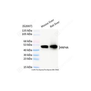 | WB检测HNF-4-alpha蛋白(货号 GB155549) . 样品: 经RIPA裂解液(货号G2002)处理的蛋白质. 封闭: 3%脱脂牛奶(货号GC310001)溶于TBST溶液, 室温孵育1小时. —抗: 1: 500稀释, 4℃ 孵育过夜. 二抗: HRP标记山羊抗兔IgG (H+L) (货号GB23303), 1: 5000稀释, 室温孵育1小时. |