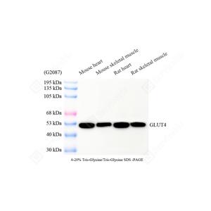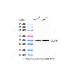 | WB检测Glucose Transporter GLUT4蛋白(货号 GB152175). 样品: 经RIPA裂解液(货号G2002)处理的蛋白质. 封闭: 3%脱脂牛奶(货号GC310001)溶于TBST溶液, 室温孵育1小时. —抗: 1: 500稀释, 4℃ 孵育过夜. 二抗: HRP标记山羊抗小鼠IgG (H+L) (货号GB23301), 1: 5000稀释, 室温孵育1小时. |