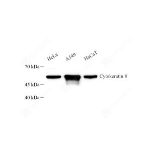 WB检测Cytokeratin 8蛋白(货号 GB15231). 样品: 经RIPA裂解液(货号G2002)处理的蛋白质. 封闭: 3%脱脂牛奶(货号GC310001)溶于TBST溶液, 室温孵育1小时. —抗: 1: 1000稀释, 4℃ 孵育过夜. 二抗: HRP标记山羊抗小鼠IgG (H+L) (货号GB23301), 1: 5000稀释, 室温孵育1小时. |