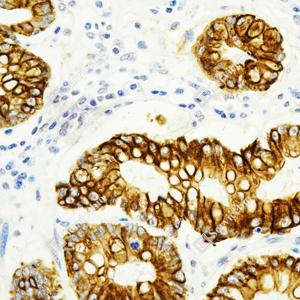 IHC检测Cytokeratin 8蛋白(货号 GB15231). 样品: 人胃癌, 4%多聚甲醛 (货号G1101) 固定12-24小时. 抗原修复: 柠檬酸抗原修复液(干粉, pH 6.0) (G1201), 高压锅均匀喷气计时2分钟. —抗: 1: 500稀释, 4℃ 孵育过夜. 二抗: HRP标记山羊抗小鼠IgG (H+L) (货号GB23301), 1: 200稀释, 室温孵育1小时. |