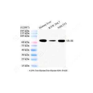 | WB检测Scavenger receptor BI (SR-BI)蛋白(货号 GB153319). 样品: 经RIPA裂解液(货号G2002)处理的蛋白质. 封闭: 3%脱脂牛奶(货号GC310001)溶于TBST溶液, 室温孵育1小时. —抗: 1: 1000稀释, 4℃ 孵育过夜. 二抗: HRP标记山羊抗兔IgG (H+L) (货号GB23303), 1: 5000稀释, 室温孵育1小时. |