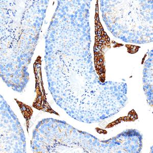 | IHC检测Scavenger receptor BI (SR-BI)蛋白(货号 GB153319). 样品: 小鼠睾丸, 4%多聚甲醛 (货号G1101) 固定12-24小时. 抗原修复: 柠檬酸抗原修复液 (干粉, pH 6.0) (G1201), 高压锅均匀喷气计时2分钟. —抗: 1: 50稀释, 4℃ 孵育过夜. 二抗: S-vision免疫组化多聚二抗(山羊抗兔),即用型 (货号G1302), 室温孵育20分钟. |