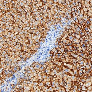 | IHC检测 Scavenger receptor BI (SR-BI)蛋白(货号 GB153319). 样品: 人肝, 4%多聚甲醛 (货号G1101) 固定12-24小时. 抗原修复: 柠檬酸抗原修复液 (干粉, pH 6.0) (G1201), 高压锅均匀喷气计时2分钟. —抗: 1: 50稀释, 4℃ 孵育过夜. 二抗: S-vision免疫组化多聚二抗(山羊抗兔),即用型 (货号G1302), 室温孵育20分钟. |