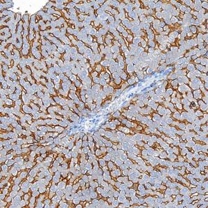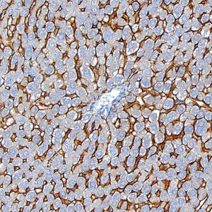 | IHC检测 Scavenger receptor BI (SR-BI)蛋白(货号 GB153319). 样品: 小鼠肝, 4%多聚甲醛 (货号G1101) 固定12-24小时. 抗原修复: 柠檬酸抗原修复液 (干粉, pH 6.0) (G1201), 高压锅均匀喷气计时2分钟. —抗: 1: 50稀释, 4℃ 孵育过夜. 二抗: S-vision免疫组化多聚二抗(山羊抗兔),即用型 (货号G1302), 室温孵育20分钟. |