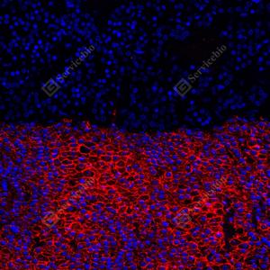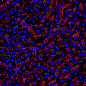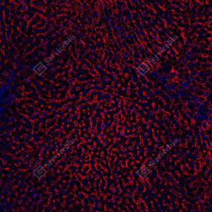 | IF检测Scavenger receptor BI (SR-BI)蛋白(货号 GB153319)(红色). 样品: 小鼠肝, 4%多聚甲醛 (货号G1101) 固定12-24小时. 抗原修复: 柠檬酸抗原修复液 (干粉, pH 6.0) (G1201), 高压锅均匀喷气计时2分钟. —抗: 1: 50稀释, 4℃ 孵育过夜. 二抗: Cy3标记山羊抗兔IgG (H+L) (货号GB21303), 1: 300稀释, 室温孵育1小时. |