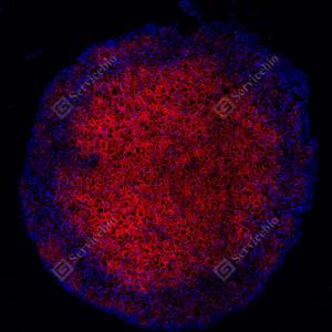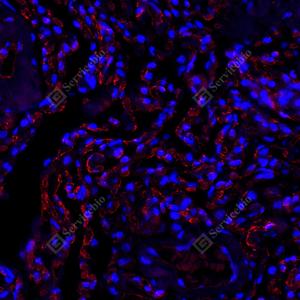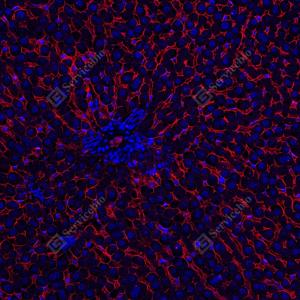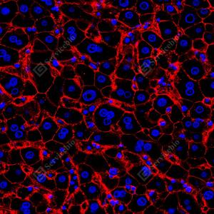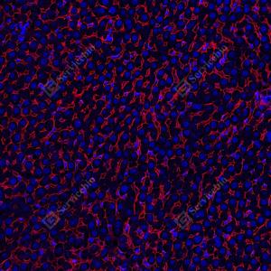 | IF检测Scavenger receptor BI (SR-BI)蛋白(货号 GB153319)(红色). 样品: 人肝, 4%多聚甲醛 (货号G1101) 固定12-24小时. 抗原修复: 柠檬酸抗原修复液 (干粉, pH 6.0) (G1201), 高压锅均匀喷气计时2分钟. —抗: 0. 0763888888888889稀释, 4℃ 孵育过夜. 二抗: Cy3标记山羊抗兔IgG (H+L) (货号GB21303), 1: 300稀释, 室温孵育1小时. |