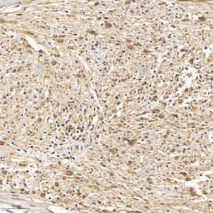 | IHC检测TrkB蛋白(货号 GB11295-2). 样品: 人神经鞘瘤, 4%多聚甲醛 (货号G1101) 固定12-24小时. 抗原修复: 柠檬酸抗原修复液(干粉, pH 6.0) (G1201), 98℃, 20分钟. —抗: 1: 800稀释, 4℃ 孵育过夜. 二抗: HRP标记山羊抗兔IgG (H+L) (货号GB23303), 1: 200稀释, 室温孵育1小时. |
