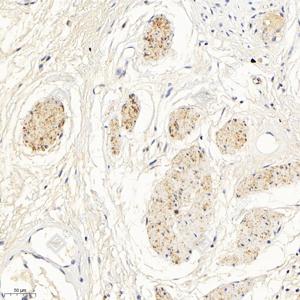 | IHC检测TrkB蛋白(货号 GB11295-2). 样品: 人胃, 4%多聚甲醛 (货号G1101) 固定12-24小时. 抗原修复: 柠檬酸抗原修复液(干粉, pH 6.0) (G1201), 98℃, 20分钟. —抗: 1: 1000稀释, 4℃ 孵育过夜. 二抗: HRP标记山羊抗兔IgG (H+L) (货号GB23303), 1: 200稀释, 室温孵育1小时. |