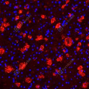 IF检测Apolipoprotein E蛋白(货号 GB115743)(红色). 样品: 小鼠阿尔茨海默病脑组织, 4%多聚甲醛 (货号G1101) 固定12-24小时. 抗原修复: Tris-EDTA抗原修复液(pH 9.0) (G1203), 98℃, 20分钟. 封闭: 3% BSA(货号GC305010)的PBS溶液, 室温孵育30分钟. —抗: 1: 500稀释, 4℃ 孵育过夜. 二抗: Cy3标记山羊抗兔IgG (H+L) (货号GB21303), 1: 300稀释, 室温孵育1小时. |