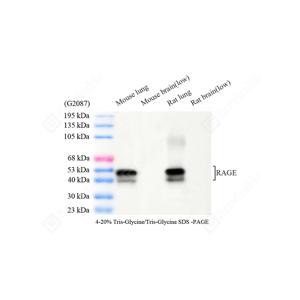 | WB检测RAGE蛋白(货号 GB15278). 样品: 经RIPA裂解液(货号G2002)处理的蛋白质. 封闭: 3%脱脂牛奶(货号GC310001)溶于TBST溶液, 室温孵育1小时. —抗: 1: 1000稀释, 4℃ 孵育过夜. 二抗: HRP标记山羊抗兔IgG (H+L) (货号GB23303), 1: 5000稀释, 室温孵育1小时. |