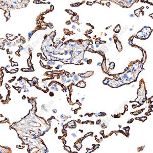 | IHC检测RAGE蛋白(货号 GB15278). 样品: 人肺, 4%多聚甲醛 (货号G1101) 固定12-24小时. 抗原修复: 抗原修复仪 (货号 ARI-4),Tris-EDTA抗原修复液(pH 9.0) (货号G1203), 水浴100℃, 25分钟. —抗: 1: 2000稀释, 4℃ 孵育过夜. 二抗: S-vision免疫组化多聚二抗(山羊抗兔),即用型 (货号G1302), 室温孵育20分钟. |