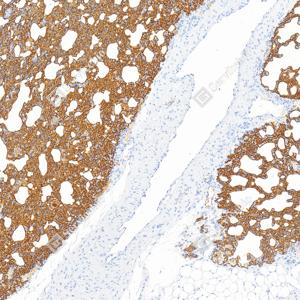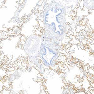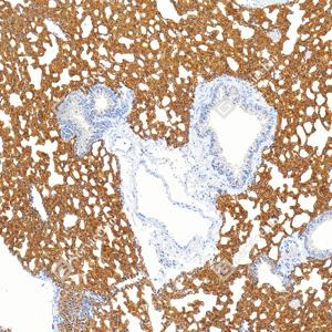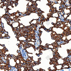 | IHC检测RAGE蛋白(货号 GB15278). 样品: 小鼠肺, 4%多聚甲醛 (货号G1101) 固定12-24小时. 抗原修复: 抗原修复仪 (货号 ARI-4),Tris-EDTA抗原修复液(pH 9.0) (货号G1203), 水浴100℃, 25分钟. —抗: 1: 2000稀释, 4℃ 孵育过夜. 二抗: S-vision免疫组化多聚二抗(山羊抗兔),即用型 (货号G1302), 室温孵育20分钟. |
