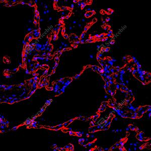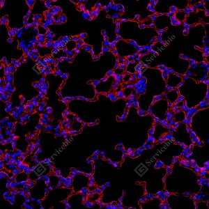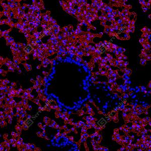 | IF检测RAGE蛋白(货号 GB15278)(红色). 样品: 小鼠肺, 4%多聚甲醛 (货号G1101) 固定12-24小时. 抗原修复: 抗原修复仪 (货号 ARI-4),Tris-EDTA抗原修复液(pH 9.0) (货号G1203), 水浴90℃, 30分钟. 封闭: 3% BSA(货号GC305010)的PBS溶液, 室温孵育30分钟. —抗: 1: 2000稀释, 4℃ 孵育过夜. 二抗: Cy3标记山羊抗兔IgG (H+L) (货号GB21303), 1: 300稀释, 室温孵育1小时. |