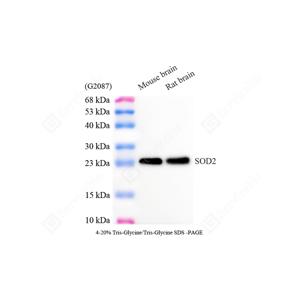 | WB检测SOD2/MnSOD蛋白(货号 GB151875). 样品: 经RIPA裂解液(货号G2002)处理的蛋白质. 封闭: 3%脱脂牛奶(货号GC310001)溶于TBST溶液, 室温孵育1小时. —抗: 1: 1000稀释, 4℃ 孵育过夜. 二抗: HRP标记山羊抗小鼠IgG (H+L) (货号GB23301), 1: 5000稀释, 室温孵育1小时. |