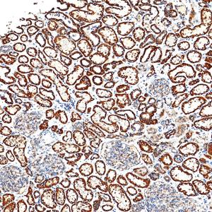 | IHC检测SOD2/MnSOD蛋白(货号 GB151875). 样品: 人肾, 4%多聚甲醛 (货号G1101) 固定12-24小时. 抗原修复: Tris-EDTA抗原修复液(pH 9.0) (G1203), 100℃, 25分钟. —抗: 1: 2500稀释, 4℃ 孵育过夜. 二抗: S-vision免疫组化多聚二抗(山羊抗小鼠), 即用型(货号G1301), 室温孵育20分钟. |