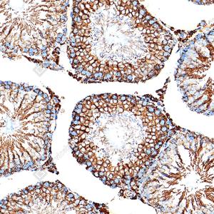 | IHC检测SOD2/MnSOD蛋白(货号 GB151875). 样品: 大鼠睾丸, 4%多聚甲醛 (货号G1101) 固定12-24小时. 抗原修复: Tris-EDTA抗原修复液(pH 9.0) (G1203), 100℃, 25分钟. —抗: 1: 2500稀释, 4℃ 孵育过夜. 二抗: S-vision免疫组化多聚二抗(山羊抗小鼠), 即用型(货号G1301), 室温孵育20分钟. |