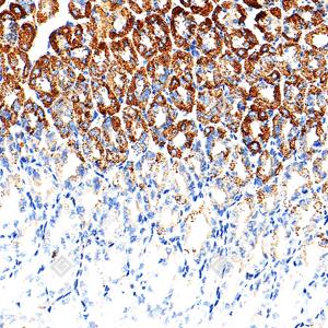 | IHC检测SOD2/MnSOD蛋白(货号 GB151875). 样品: 小鼠胃, 4%多聚甲醛 (货号G1101) 固定12-24小时. 抗原修复: Tris-EDTA抗原修复液(pH 9.0) (G1203), 100℃, 25分钟. —抗: 1: 2500稀释, 4℃ 孵育过夜. 二抗: S-vision免疫组化多聚二抗(山羊抗小鼠), 即用型(货号G1301), 室温孵育20分钟. |