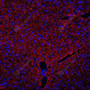 | IF检测SOD2/MnSOD蛋白(货号 GB151875)(红色). 样品: 小鼠肝, 4%多聚甲醛 (货号G1101) 固定12-24小时. 抗原修复: Tris-EDTA抗原修复液(pH 9.0) (G1203), 100℃, 25分钟. 封闭: 3% BSA(货号GC305010)的PBS溶液, 室温孵育30分钟. —抗: 1: 2500稀释, 4℃ 孵育过夜. 二抗: Cy3标记山羊抗小鼠IgG (H+L) (货号GB21301), 1: 300稀释, 室温孵育1小时. |