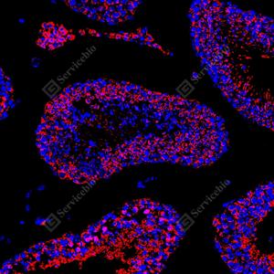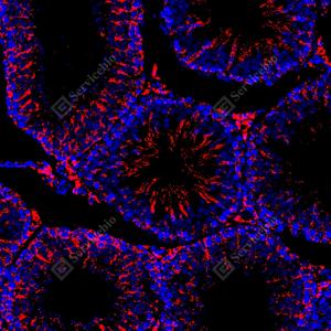 | IF检测SOD2/MnSOD蛋白(货号 GB151875)(红色). 样品: 小鼠睾丸, 4%多聚甲醛 (货号G1101) 固定12-24小时. 抗原修复: Tris-EDTA抗原修复液(pH 9.0) (G1203), 100℃, 25分钟. 封闭: 3% BSA(货号GC305010)的PBS溶液, 室温孵育30分钟. —抗: 1: 2500稀释, 4℃ 孵育过夜. 二抗: Cy3标记山羊抗小鼠IgG (H+L) (货号GB21301), 1: 300稀释, 室温孵育1小时. |