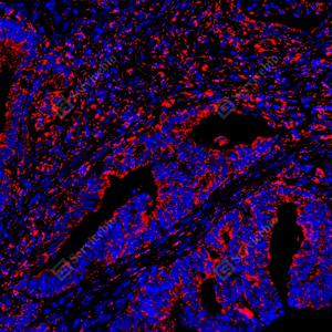 | IF检测SOD2/MnSOD蛋白(货号 GB151875)(红色). 样品: 人结肠癌, 4%多聚甲醛 (货号G1101) 固定12-24小时. 抗原修复: Tris-EDTA抗原修复液(pH 9.0) (G1203), 100℃, 25分钟. 封闭: 3% BSA(货号GC305010)的PBS溶液, 室温孵育30分钟. —抗: 1: 2500稀释, 4℃ 孵育过夜. 二抗: Cy3标记山羊抗小鼠IgG (H+L) (货号GB21301), 1: 300稀释, 室温孵育1小时. |