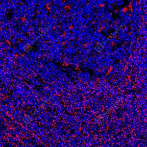| IF检测SOD2/MnSOD蛋白(货号 GB151875)(红色). 样品: 人扁桃体, 4%多聚甲醛 (货号G1101) 固定12-24小时. 抗原修复: Tris-EDTA抗原修复液(pH 9.0) (G1203), 100℃, 25分钟. 封闭: 3% BSA(货号GC305010)的PBS溶液, 室温孵育30分钟. —抗: 1: 2500稀释, 4℃ 孵育过夜. 二抗: Cy3标记山羊抗小鼠IgG (H+L) (货号GB21301), 1: 300稀释, 室温孵育1小时. |