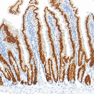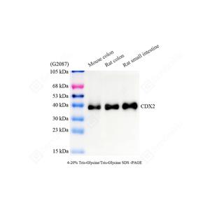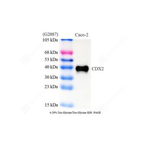 CDX2, also named as Homeobox protein CDX-2, is a 313 amino acid protein, which contains one homeobox DNA-binding domain and belongs to the Caudal homeobox family. CDX2 localizes in the nucleus and is involved in the transcriptional regulation of multiple genes expression in the intestinal epithelium. The relative expression of CDX1 to CDX2 protein may be important in the anterior to posterior patterning of the intestinal epithelium and in defining patterns of proliferation and differentiation along the crypt-villus axis.