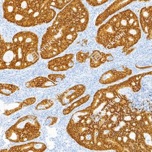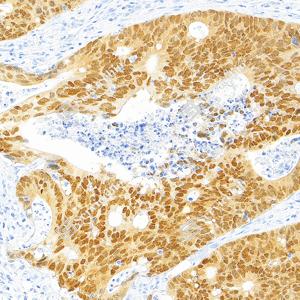 | IHC检测CDX2蛋白(货号 GB150083). 样品: 人结肠癌, 4%多聚甲醛 (货号G1101) 固定12-24小时. 抗原修复: Tris-EDTA抗原修复液(pH 9.0) (G1203), 100℃, 25分钟. —抗: 1: 10000稀释, 4℃ 孵育过夜. 二抗: S-vision免疫组化多聚二抗(山羊抗兔),即用型 (货号G1302), 室温孵育20分钟. |