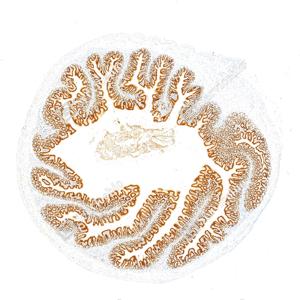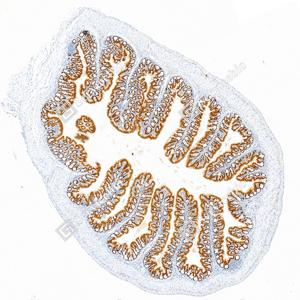 | IHC检测CDX2蛋白(货号 GB150083). 样品: 小鼠小肠, 4%多聚甲醛 (货号G1101) 固定12-24小时. 抗原修复: Tris-EDTA抗原修复液(pH 9.0) (G1203), 100℃, 25分钟. —抗: 1: 10000稀释, 4℃ 孵育过夜. 二抗: S-vision免疫组化多聚二抗(山羊抗兔),即用型 (货号G1302), 室温孵育20分钟. |