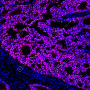 | IF检测CDX2蛋白(货号 GB150083)(红色). 样品: 小鼠结肠, 4%多聚甲醛 (货号G1101) 固定12-24小时. 抗原修复: Tris-EDTA抗原修复液(pH 9.0) (G1203), 100℃, 25分钟. 封闭: 3% BSA(货号GC305010)的PBS溶液, 室温孵育30分钟. —抗: 1: 10000稀释, 4℃ 孵育过夜. 二抗: Cy3标记山羊抗兔IgG (H+L) (货号GB21303), 1: 300稀释, 室温孵育1小时. |