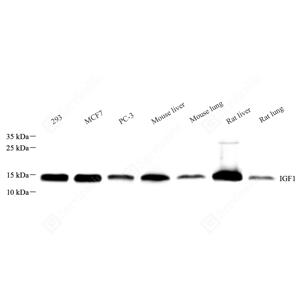 WB检测IGF1蛋白(货号 GB115653). 样品: 经RIPA裂解液(货号G2002)处理的蛋白质. 封闭: 3%脱脂牛奶(货号GC310001)溶于TBST溶液, 室温孵育1小时. —抗: 1: 300稀释, 4℃ 孵育过夜. 二抗: HRP标记山羊抗兔IgG (H+L) (货号GB23303), 1: 5000稀释, 室温孵育1小时. |