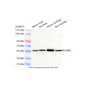 | WB检测RANKL蛋白(货号 GB125705). 样品: 经RIPA裂解液(货号G2002)处理的蛋白质. 封闭: 3%脱脂牛奶(货号GC310001)溶于TBST溶液, 室温孵育1小时. —抗: 1: 1000稀释, 4℃ 孵育过夜. 二抗: HRP标记山羊抗小鼠IgG (H+L) (货号GB23301), 1: 5000稀释, 室温孵育1小时. |