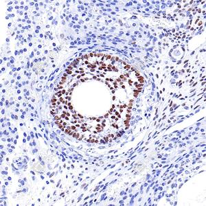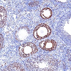 | IHC检测Wilms Tumor Protein蛋白(货号 GB15382). 样品: 小鼠卵巢, 4%多聚甲醛 (货号G1101) 固定12-24小时. 抗原修复: 抗原修复仪(货号 ARI-4),Tris-EDTA抗原修复液(pH 9.0) (货号G1203), 水浴100℃, 25分钟. —抗: 1: 3000稀释, 4℃ 孵育过夜. 二抗: S-vision免疫组化多聚二抗(山羊抗兔),即用型 (货号G1302), 室温孵育20分钟. |