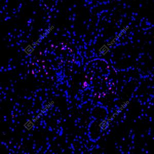 | IF检测Wilms Tumor Protein蛋白(货号 GB15382)(红色). 样品: 小鼠肾, 4%多聚甲醛 (货号G1101) 固定12-24小时. 抗原修复: 抗原修复仪(货号 ARI-4),Tris-EDTA抗原修复液(pH 9.0) (货号G1203), 水浴100℃, 25分钟. 封闭: 3% BSA(货号GC305010)的PBS溶液, 室温孵育30分钟. —抗: 1: 3000稀释, 4℃ 孵育过夜. 二抗: Cy3标记山羊抗兔IgG (H+L) (货号GB21303), 1: 300稀释, 室温孵育1小时. |