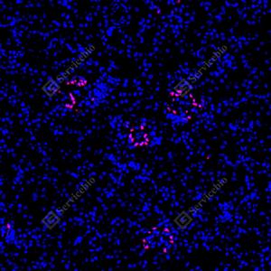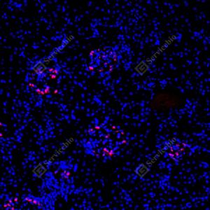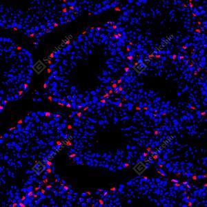 | IF检测Wilms Tumor Protein蛋白(货号 GB15382)(红色). 样品: 大鼠睾丸, 4%多聚甲醛 (货号G1101) 固定12-24小时. 抗原修复: 抗原修复仪(货号 ARI-4),Tris-EDTA抗原修复液(pH 9.0) (货号G1203), 水浴100℃, 25分钟. 封闭: 3% BSA(货号GC305010)的PBS溶液, 室温孵育30分钟. —抗: 1: 3000稀释, 4℃ 孵育过夜. 二抗: Cy3标记山羊抗兔IgG (H+L) (货号GB21303), 1: 300稀释, 室温孵育1小时. |