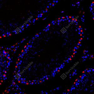 | IF检测Wilms Tumor Protein蛋白(货号 GB15382)(红色). 样品: 小鼠睾丸, 4%多聚甲醛 (货号G1101) 固定12-24小时. 抗原修复: 抗原修复仪(货号 ARI-4),Tris-EDTA抗原修复液(pH 9.0) (货号G1203), 水浴100℃, 25分钟. 封闭: 3% BSA(货号GC305010)的PBS溶液, 室温孵育30分钟. —抗: 1: 3000稀释, 4℃ 孵育过夜. 二抗: Cy3标记山羊抗兔IgG (H+L) (货号GB21303), 1: 300稀释, 室温孵育1小时. |