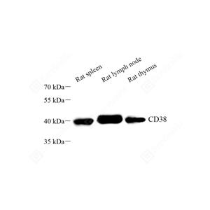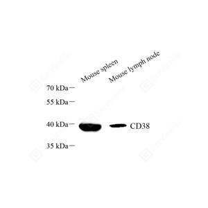 WB检测CD38蛋白(货号 GB114832). 样品: 经RIPA裂解液(货号G2002)处理的蛋白质. 封闭: 3%脱脂牛奶(货号GC310001)溶于TBST溶液, 室温孵育1小时. —抗: 1: 1000稀释, 4℃ 孵育过夜. 二抗: HRP标记山羊抗兔IgG (H+L) (货号GB23303), 1: 5000稀释, 室温孵育1小时. |