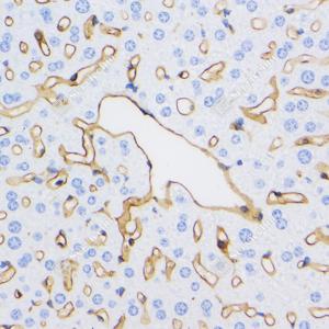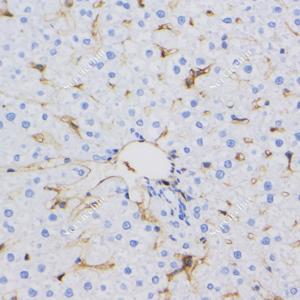 IHC检测CD38蛋白(货号 GB114832). 样品: 小鼠肝, 4%多聚甲醛 (货号G1101) 固定12-24小时. 抗原修复: 柠檬酸抗原修复液(干粉, pH 6.0) (G1201), 98℃, 20分钟. —抗: 1: 200稀释, 4℃ 孵育过夜. 二抗: HRP标记山羊抗兔IgG (H+L) (货号GB23303), 1: 200稀释, 室温孵育1小时. |