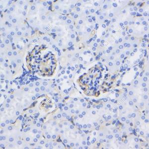 IHC检测CD38蛋白(货号 GB114832). 样品: 小鼠肾, 4%多聚甲醛 (货号G1101) 固定12-24小时. 抗原修复: 柠檬酸抗原修复液(干粉, pH 6.0) (G1201), 98℃, 20分钟. —抗: 1: 200稀释, 4℃ 孵育过夜. 二抗: HRP标记山羊抗兔IgG (H+L) (货号GB23303), 1: 200稀释, 室温孵育1小时. |