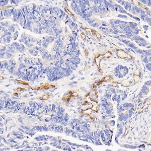 IHC检测CD105蛋白(货号 GB113377). 样品: 人结肠癌, 4%多聚甲醛 (货号G1101) 固定12-24小时. 抗原修复: 柠檬酸抗原修复液(干粉, pH 6.0) (G1201), 98℃, 20分钟. —抗: 1: 1000稀释, 4℃ 孵育过夜. 二抗: HRP标记山羊抗兔IgG (H+L) (货号GB23303), 1: 200稀释, 室温孵育1小时. |