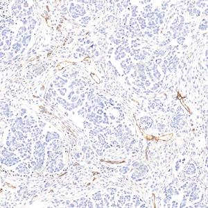 IHC检测CD105蛋白(货号 GB113377). 样品: 人卵巢癌, 4%多聚甲醛 (货号G1101) 固定12-24小时. 抗原修复: 柠檬酸抗原修复液(干粉, pH 6.0) (G1201), 98℃, 20分钟. —抗: 1: 1000稀释, 4℃ 孵育过夜. 二抗: HRP标记山羊抗兔IgG (H+L) (货号GB23303), 1: 200稀释, 室温孵育1小时. |