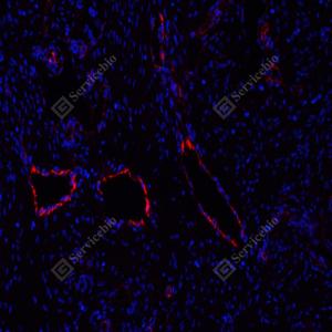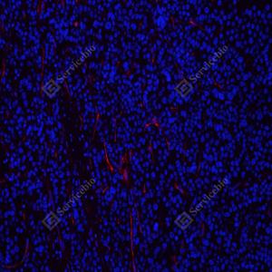 IF检测CD105蛋白(货号 GB113377)(红色). 样品: 人卵巢癌, 4%多聚甲醛 (货号G1101) 固定12-24小时. 抗原修复: Tris-EDTA抗原修复液(pH 9.0) (G1203), 98℃, 20分钟. 封闭: 3% BSA(货号GC305010)的PBS溶液, 室温孵育30分钟. —抗: 1: 700稀释, 4℃ 孵育过夜. 二抗: Cy3标记山羊抗兔IgG (H+L) (货号GB21303), 1: 300稀释, 室温孵育1小时. |