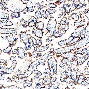 | IHC检测CD105蛋白(货号 GB150113). 样品: 人胎盘, 4%多聚甲醛 (货号G1101) 固定12-24小时. 抗原修复: Tris-EDTA抗原修复液(pH 9.0) (G1203), 100℃, 25分钟. —抗: 1: 500稀释, 4℃ 孵育过夜. 二抗: S-vision免疫组化多聚二抗(山羊抗小鼠), 即用型(货号G1301), 室温孵育20分钟. |