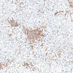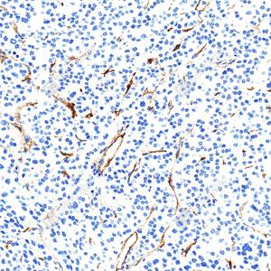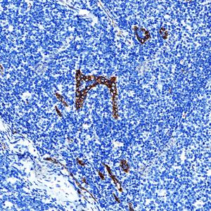 | IHC检测CD105蛋白(货号 GB150113). 样品: 人扁桃体, 4%多聚甲醛 (货号G1101) 固定12-24小时. 抗原修复: Tris-EDTA抗原修复液(pH 9.0) (G1203), 100℃, 25分钟. —抗: 1: 500稀释, 4℃ 孵育过夜. 二抗: S-vision免疫组化多聚二抗(山羊抗小鼠), 即用型(货号G1301), 室温孵育20分钟. |