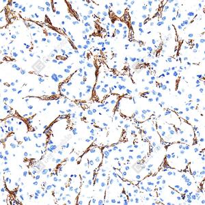 | IHC检测CD105蛋白(货号 GB150113). 样品: 人肝癌, 4%多聚甲醛 (货号G1101) 固定12-24小时. 抗原修复: Tris-EDTA抗原修复液(pH 9.0) (G1203), 100℃, 25分钟. —抗: 1: 500稀释, 4℃ 孵育过夜. 二抗: S-vision免疫组化多聚二抗(山羊抗小鼠), 即用型(货号G1301), 室温孵育20分钟. |