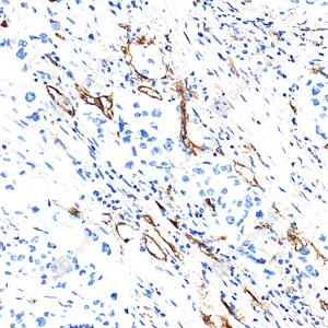 | IHC检测CD105蛋白(货号 GB150113). 样品: 人肝胆管癌, 4%多聚甲醛 (货号G1101) 固定12-24小时. 抗原修复: Tris-EDTA抗原修复液(pH 9.0) (G1203), 100℃, 25分钟. —抗: 1: 500稀释, 4℃ 孵育过夜. 二抗: S-vision免疫组化多聚二抗(山羊抗小鼠), 即用型(货号G1301), 室温孵育20分钟. |