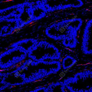 | IF检测CD105蛋白(货号 GB150113)(红色). 样品: 人结肠癌, 4%多聚甲醛 (货号G1101) 固定12-24小时. 抗原修复: Tris-EDTA抗原修复液(pH 9.0) (G1203), 100℃, 25分钟. 封闭: 3% BSA(货号GC305010)的PBS溶液, 室温孵育30分钟. —抗: 1: 500稀释, 4℃ 孵育过夜. 二抗: Cy3标记山羊抗小鼠IgG (H+L) (货号GB21301), 1: 300稀释, 室温孵育1小时. |