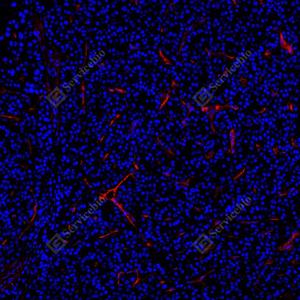 | IF检测CD105蛋白(货号 GB150113)(红色). 样品: 人卵巢癌, 4%多聚甲醛 (货号G1101) 固定12-24小时. 抗原修复: Tris-EDTA抗原修复液(pH 9.0) (G1203), 100℃, 25分钟. 封闭: 3% BSA(货号GC305010)的PBS溶液, 室温孵育30分钟. —抗: 1: 500稀释, 4℃ 孵育过夜. 二抗: Cy3标记山羊抗小鼠IgG (H+L) (货号GB21301), 1: 300稀释, 室温孵育1小时. |