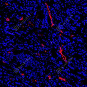 | IF检测CD105蛋白(货号 GB150113)(红色). 样品: 人肝癌, 4%多聚甲醛 (货号G1101) 固定12-24小时. 抗原修复: Tris-EDTA抗原修复液(pH 9.0) (G1203), 100℃, 25分钟. 封闭: 3% BSA(货号GC305010)的PBS溶液, 室温孵育30分钟. —抗: 1: 500稀释, 4℃ 孵育过夜. 二抗: Cy3标记山羊抗小鼠IgG (H+L) (货号GB21301), 1: 300稀释, 室温孵育1小时. |